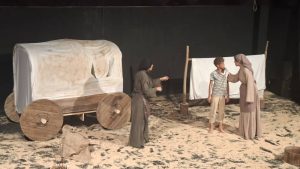 در این نمایش ، خانه ای بسیار کوچک و ساده میبینیم که نمادی از ذهن بسته این دو زن است، گلدان گلی خشک که در هر دو روز آن ها به آن گل آب میدهند که استعاره به آشتی و ارتباط بشر با طبیعت دارد.